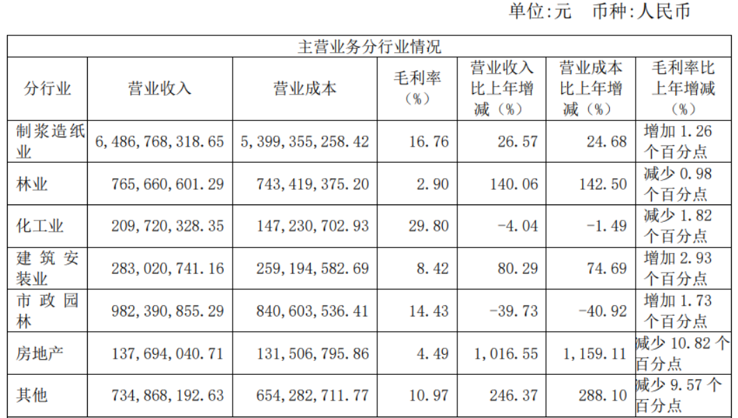 岳阳林纸属于国内大型文化用纸、包装纸、工业用纸生产、销售的造纸类企业,同时亦有从事林业勘查设计、生态碳汇开发、景观设计、园林工程施工养护等业务。2022年公司制浆造纸业务贡献了64.87亿元的营收,占当期总营收的66%。