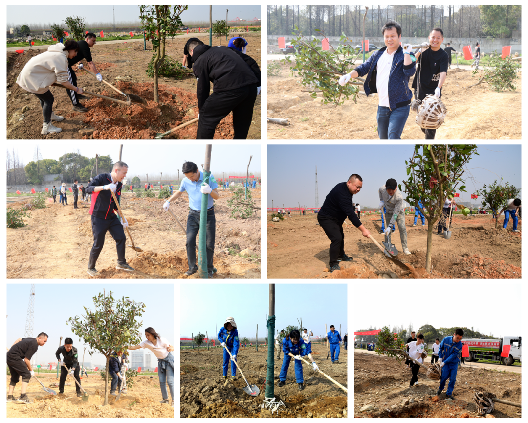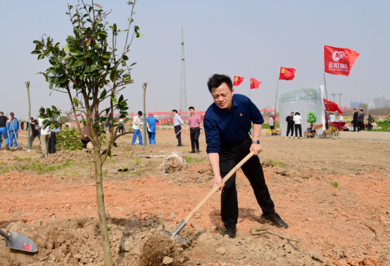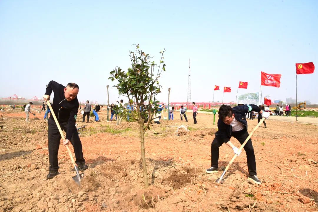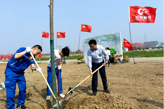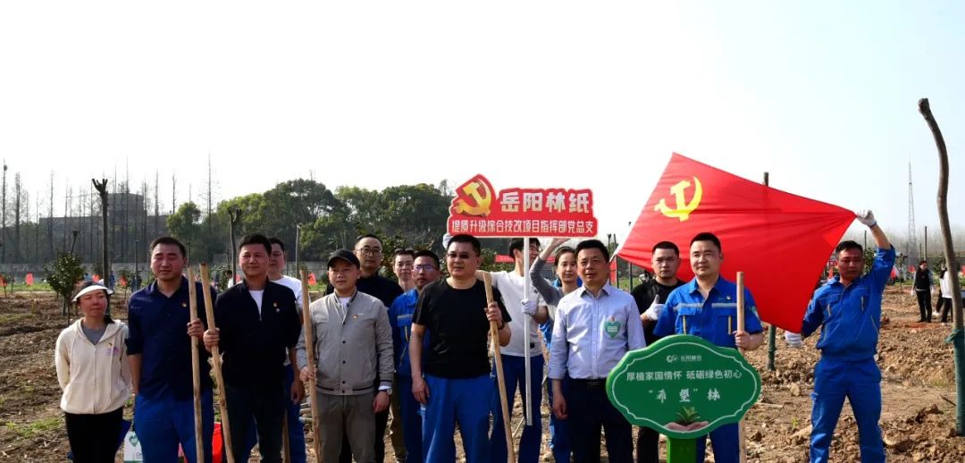 新时代新项目新征程,项目梦生态梦同梦同圆。3月15日,岳阳林纸提质升级综合技改项目一期建设工地,党旗招展,号子交融,一场“春天植绿人的聚会”依约而来,公司领导叶蒙、李战、袁国利、钟秋生、赵庆义、尤昌善、吴登峰,与岳阳林纸生态浆纸、生态园林、生态农林、生态化工“四大生态大家庭”的百余名员工挥锹培土,为新项目打造第一道绿色长廊。