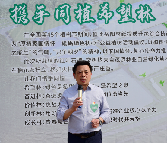 “孟春之月,盛德在木。”“全国绿化劳动模范”、岳阳林纸党委书记、董事长叶蒙已在今年植树节参加两场植树活动。他表示,岳阳林纸,因林而兴,林纸结合,林纸和谐。一是要矢志不移践行“两山”理论,深刻理解绿色发展内涵,引导党员职工做好“点绿成金”新文章,为国家生态绿化事业作出积极贡献;二是怀抱美化家园、建功有我的担当。面对项目攻坚、重点工作等,敢于举旗亮剑冲在前,能做事、会做事、做成事;三是种下希望林,收获幸福果。植树活动位于公司新项目区域,是公司希望所在,也是我们全体员工的目标所在,要牢记使命、不忘初心,以建设家乡为己任,把环境美化好、把项目建设好。