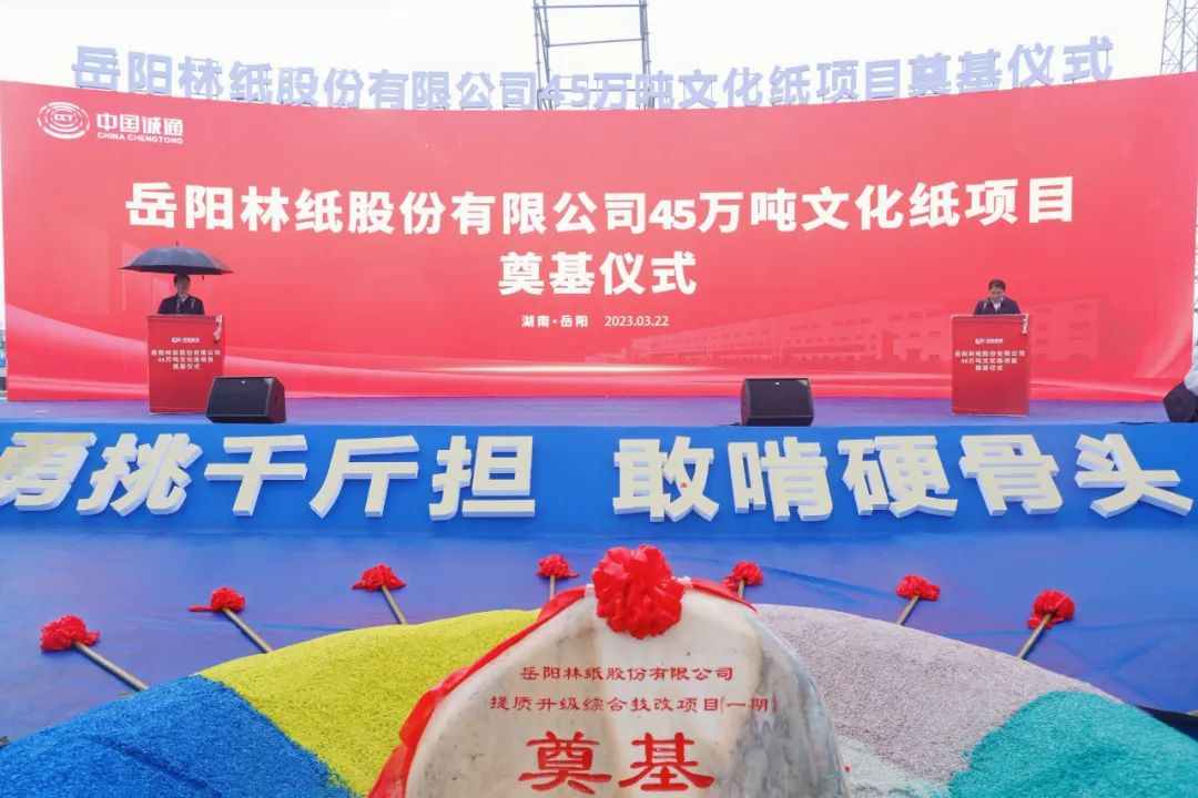 3月22日,岳阳林纸提质升级综合技改项目一期年产45万吨文化纸项目奠基仪式在岳阳市城陵矶新港区举行。中国纸业所属岳阳林纸将建成世界车速最高、单日产能最大、控制最先进的文化纸机。
