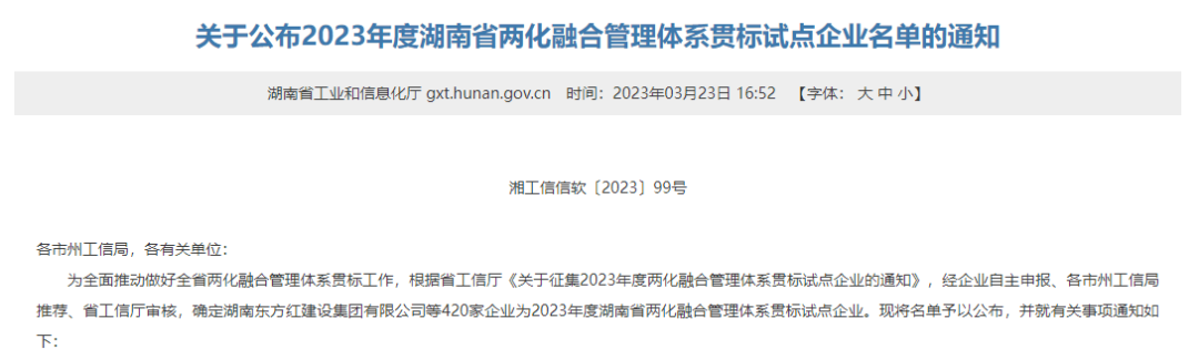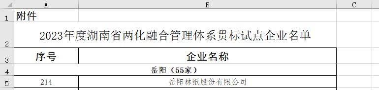 3月21日,湖南省工业和信息化厅发布《关于公布2023年度湖南省两化融合管理体系贯标试点企业名单的通知》,岳阳林纸成功入选2023年度湖南省两化融合管理体系贯标试点企业。