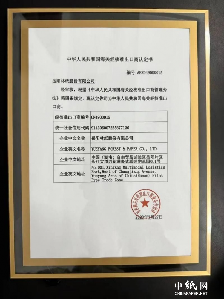 3月27日,湖南省公布首批次经海关核准认定的出口企业15家,岳阳林纸股份有限公司位列其中,且为目前岳阳市唯一一家经认定的出口企业。