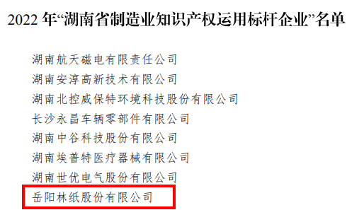 近日,湖南省工业和信息化厅公布“2022年''湖南省制造业品牌培育示范企业''''湖南省制造业知识产权运用标杆企业''名单的通知”。岳阳林纸经过层层筛选评定,荣获“湖南省制造业知识产权运用标杆企业”。
