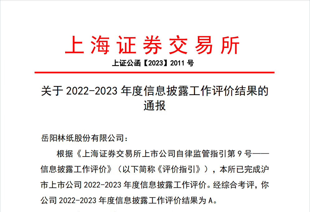 近期,上海证券交易所(以下简称“上交所”)2022-2023年度信息披露工作评价结果出炉,岳阳林纸凭借高质量的信息披露、规范的公司运作以及良好的投资者关系管理,获得上交所2022-2023年度信息披露工作最高考核评价“A级”。本次考核覆盖2160家沪市上市公司,其中考核结果为“A级”的公司400家,占比18.5%。