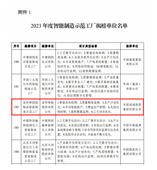 近期,工信部、国家发改委、财政部、国务院国资委、国家市场监督管理总局等五部委联合对外公布2023年度智能制造示范工厂揭榜单位和优秀场景名单,岳阳林纸入选2023年度智能制造示范工厂揭榜单位名单。这是公司继获评湖南省智能制造标杆企业之后,再次获评国家级智能制造示范工厂。