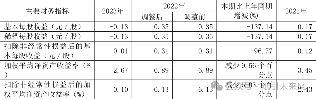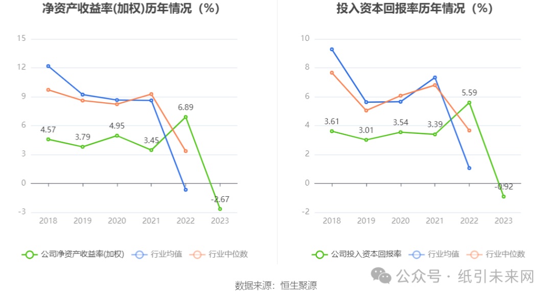 数据显示,2023年公司加权平均净资产收益率为-2.67%,较上年同期下降9.56个百分点;公司2023年投入资本回报率为-0.92%,较上年同期下降6.51个百分点。
