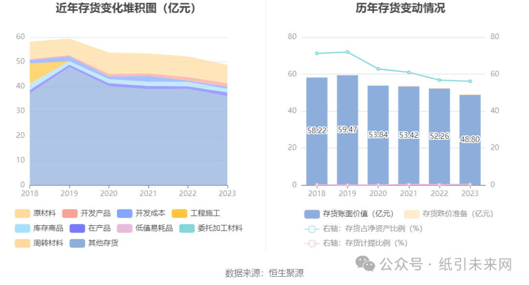 从存货变动来看,截至2023年年末,公司存货账面价值为48.8亿元,占净资产的56.19%,较上年末减少3.46亿元。其中,存货跌价准备为2293.41万元,计提比例为0.47%。