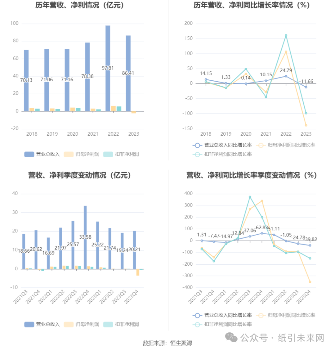 岳阳林纸(600963)4月4日披露2023年年报。2023年,公司实现营业总收入86.41亿元,同比下降11.66%;归母净利润亏损2.38亿元,上年同期盈利6.16亿元;扣非净利润922.04万元,同比下降98.32%;经营活动产生的现金流量净额为10.56亿元,同比增长38.98%;报告期内,岳阳林纸基本每股收益为-0.13元,加权平均净资产收益率为-2.67%。