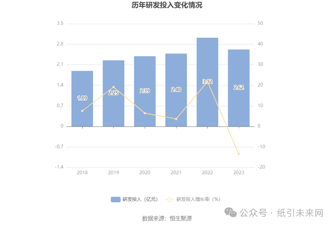 2023年全年,公司研发投入金额为2.62亿元,同比下降13.34%;研发投入占营业收入比例为3.03%,相比上年同期下降0.06个百分点。此外,公司全年研发投入资本化率为0。