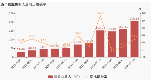 宝胜股份2021年8月31日披露中报,数据显示公司2021上半年实现营业总收入205.9亿,同比增长29.2%;实现归母净利润1.9亿,同比增长46.5%。