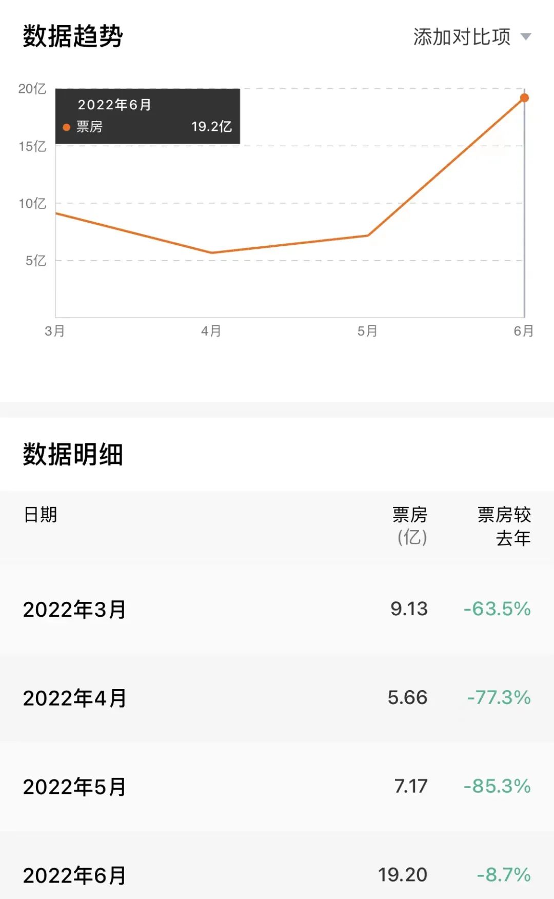 猫眼专业平台显示,上半年,全国电影票房171.8亿元,较2021年同期下降37.7%,观影人次3.98亿,较2021年同期下降41.7%。而2022年3-6月,全国电影票房仅41.1亿元,较2021年同期下降65.6%,其中3月、4月、5月票房均创下多年来新低。