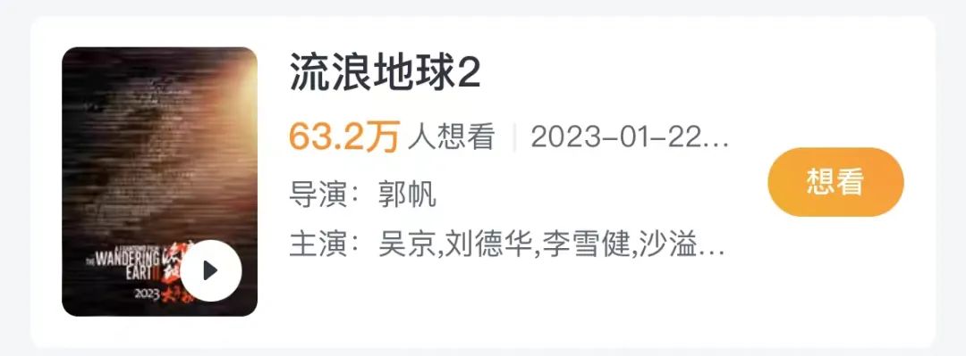 淘票票的新片想看榜上,《流浪地球2》已有63.2万人“想看”。