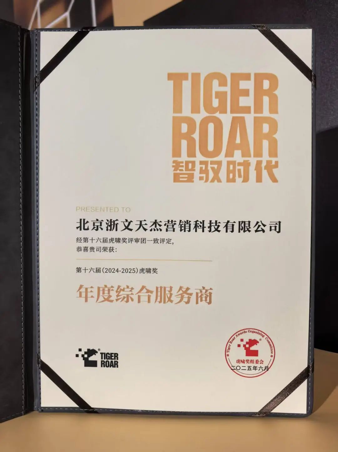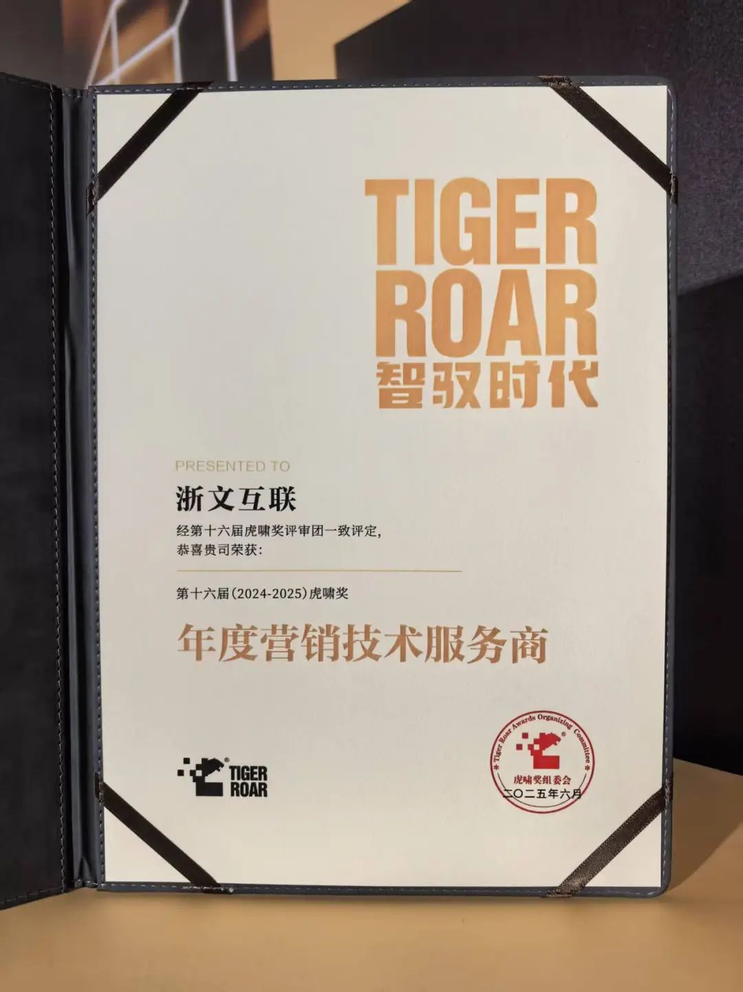 6月5日至6日,第十七届广告主大会暨金远奖颁奖盛典与第十六届虎啸奖颁奖典礼相继举行。浙文互联凭借AI科技赋能营销的创新实践,荣膺虎啸奖"年度营销技术服务商"称号,旗下子公司百孚思与浙文天杰双双获得"年度综合服务商"机构类大奖,再次彰显在数字营销领域的领先地位。