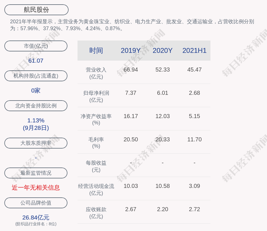 2021年半年报显示,航民股份的主营业务为黄金珠宝业、纺织业、电力生产业、批发业、交通运输业,占营收比例分别为:57.96%、37.92%、7.93%、4.24%、0.87%。