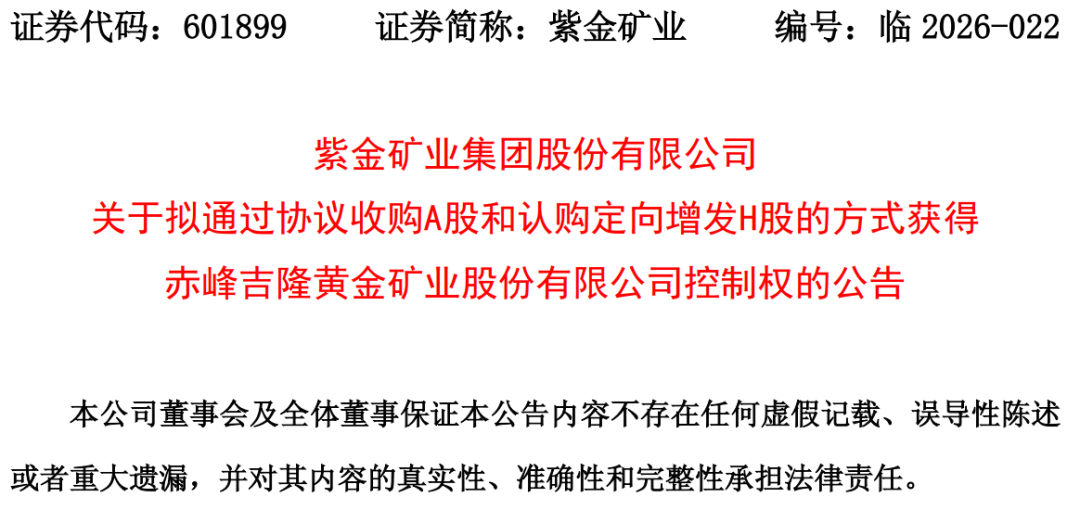 3月23日上午,紫金矿业(601899.SH/02899.HK)公告称,全资子公司紫金黄金与赤峰黄金(600988.SH/06693.HK)控股股东李金阳及其一致行动人浙江瀚丰签署《股份转让协议》。