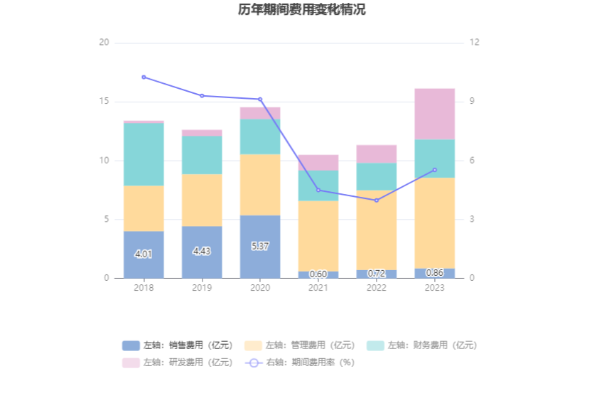 2023年,公司期间费用为16.13亿元,较上年同期增加4.80亿元;期间费用率为5.53%,较上年同期上升1.55个百分点。其中,销售费用同比增长19.65%,管理费用同比增长13.74%,研发费用同比增长185.76%,财务费用同比增长39.81%。