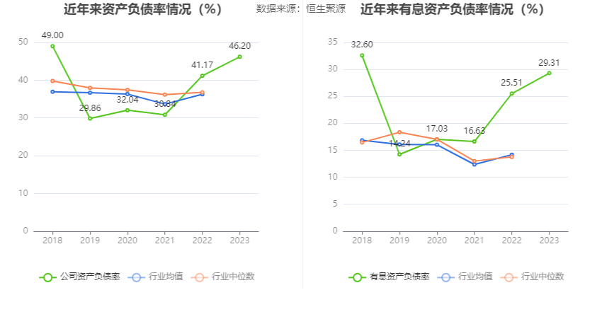 在偿债能力方面,公司2023年年末资产负债率为46.20%,相比上年末上升5.03个百分点;有息资产负债率为29.31%,相比上年末上升3.80个百分点。