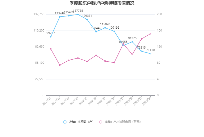 筹码集中度方面,截至2023年年末,公司股东总户数为7.11万户,较三季度末下降了4105户,降幅5.46%;户均持股市值由三季度末的139.42万元上升至152.32万元,增幅为9.25%。