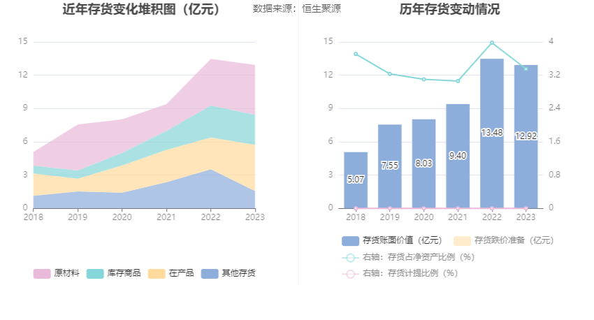 从存货变动来看,截至2023年末,公司存货账面价值为12.92亿元,占净资产的3.35%,较上年末减少5552.7万元。公司本期没有计提存货跌价准备。