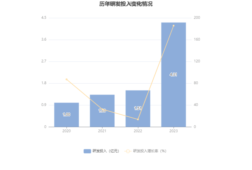 2023年全年,公司研发投入金额为4.31亿元,同比增长185.76%;研发投入占营业收入比例为1.48%,相比上年同期上升0.95个百分点。此外,公司全年研发投入资本化率为0。