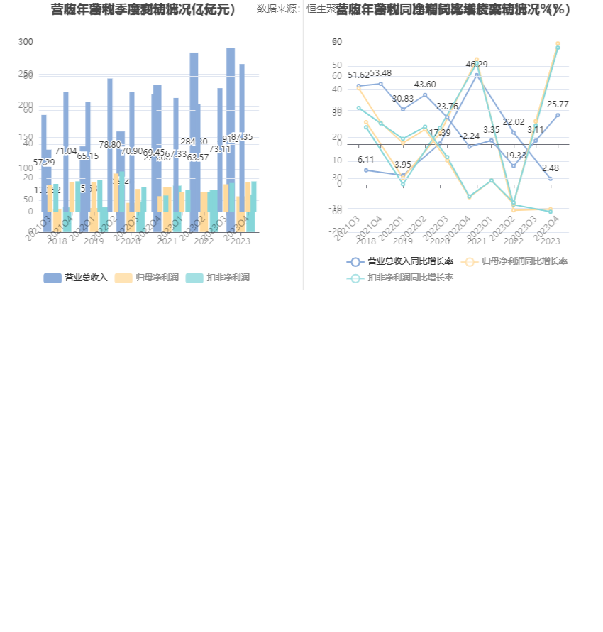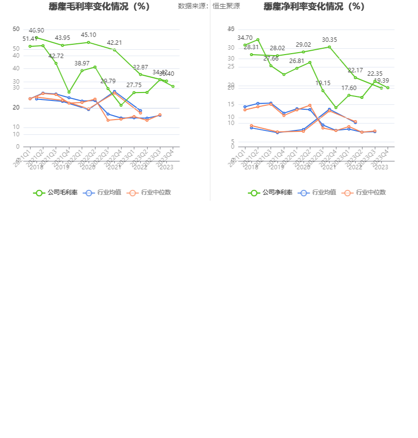 2023年,公司毛利率为30.40%,同比下降2.47个百分点;净利率为19.39%,较上年同期下降2.78个百分点。从单季度指标来看,2023年第四季度公司毛利率为30.93%,同比上升9.64个百分点,环比下降3.49个百分点;净利率为20.15%,较上年同期上升6.76个百分点,较上一季度下降2.20个百分点。