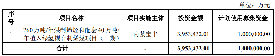 宝丰能源本次向特定对象发行股票的募集资金总额(含发行费用)不超过100.00亿元,扣除发行费用后募集资金将用于投资建设“260万吨/年煤制烯烃和配套40万吨/年植入绿氢耦合制烯烃项目(一期)”。
