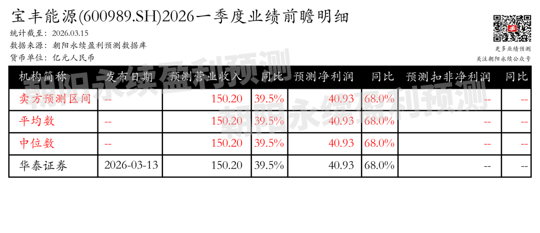 截至2026年03月15日,根据朝阳永续季度业绩前瞻数据: