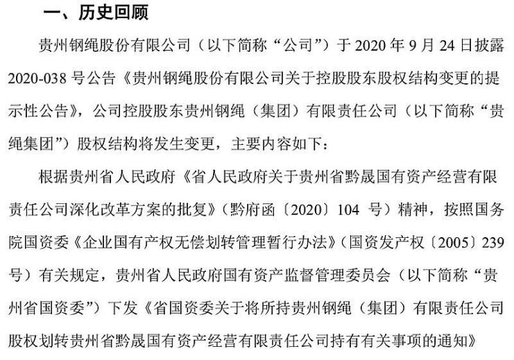 2020年12月8日,贵绳股份公告称,贵州省国资委将所持贵绳集团股权划入地方国资——贵州省黔晟国有资产经营有限责任公司。公司控股股东仍为贵绳集团,公司实际控制人仍为贵州省国资委。