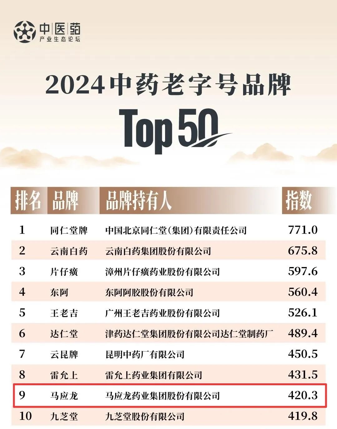 在12月15日晚举行的颁奖典礼上,马应龙药业再次荣登2024中药老字号品牌Top50,位列第九。