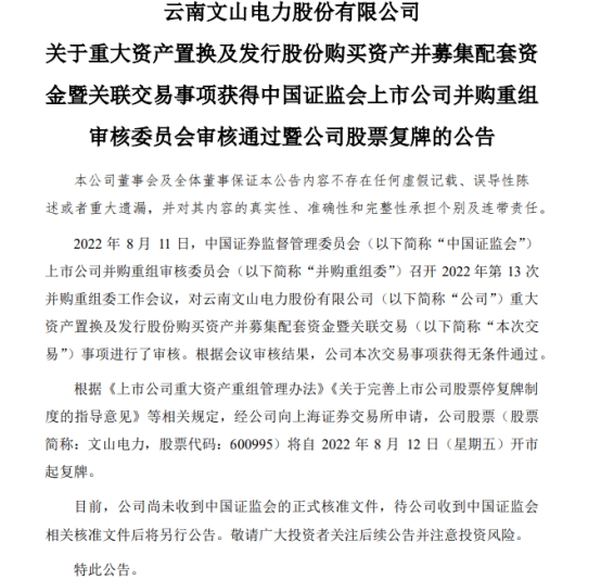 8月12日讯昨日晚间,文山电力(600995.SH)发布公告称,昨日,中国证监会上市公司并购重组审核委员会召开2022年第13次并购重组委工作会议,对公司重大资产置换及发行股份购买资产并募集配套资金暨关联交易事项进行了审核。根据会议审核结果,公司本次交易事项获得无条件通过。