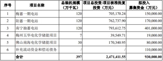 公司拟向符合条件的特定投资者非公开发行股份募集配套资金总额不超过930,000万元,募集配套资金用途为梅蓄一期电站、阳蓄一期电站、南宁抽蓄电站、梅州五华电化学储能项目、佛山南海电化学储能项目、补充流动资金和偿还债务。