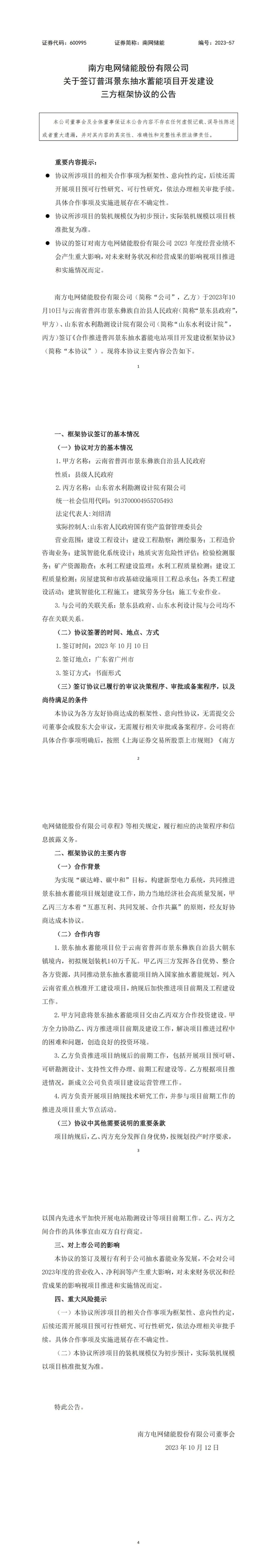 南网储能(600995)10月11日晚间公告,公司10月10日与云南省普洱市景东彝族自治县政府、山东省水利勘测设计院有限公司签订《合作推进普洱景东抽水蓄能电站项目开发建设框架协议》。景东抽水蓄能项目位于普洱市景东彝族自治县大朝东镇境内,初拟规划装机140万千瓦。