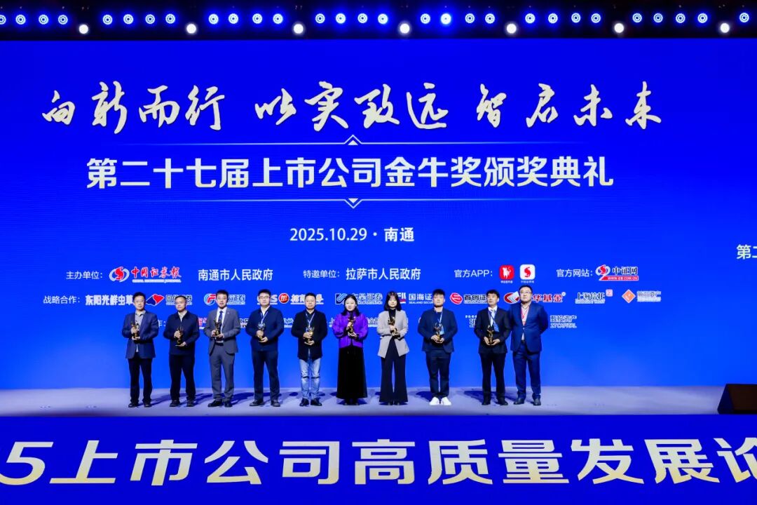 10月29日,由中国证券报主办的2025上市公司高质量发展论坛暨第二十七届上市公司金牛奖颁奖典礼在江苏南通圆满落幕。九州通医药集团股份有限公司(以下简称“九州通”或“公司”)荣获“2024年度金牛上市公司分红回报奖”和“2024年度金牛最具价值投资奖”两大奖项,九州通副总经理兼董事会秘书刘志峰荣获“2024年度金牛董秘奖”。