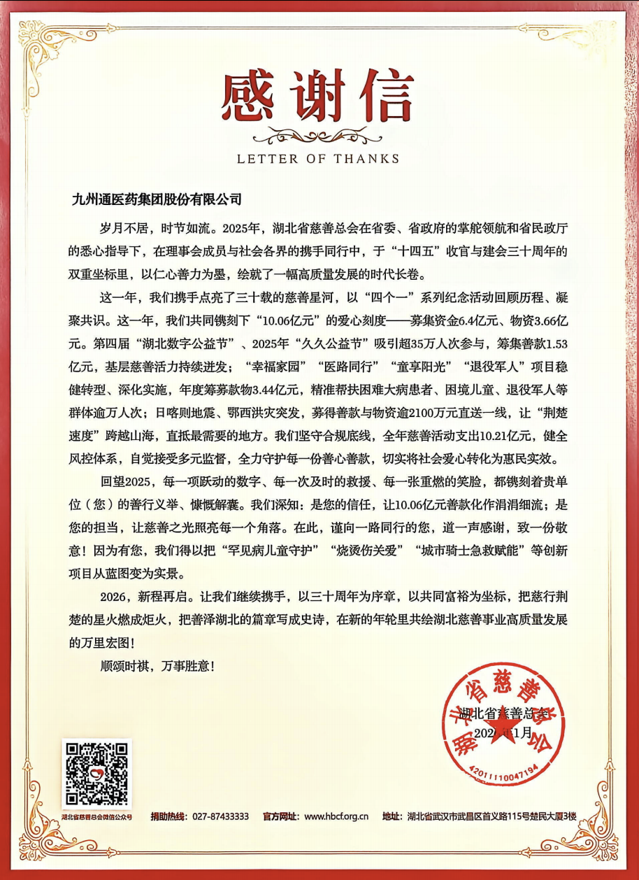 近日,九州通医药集团(以下简称“九州通”“公司”)收到来自湖北省慈善总会的感谢信,对公司长期以来践行企业社会责任、呵护民众健康,表示高度认可与诚挚感谢。