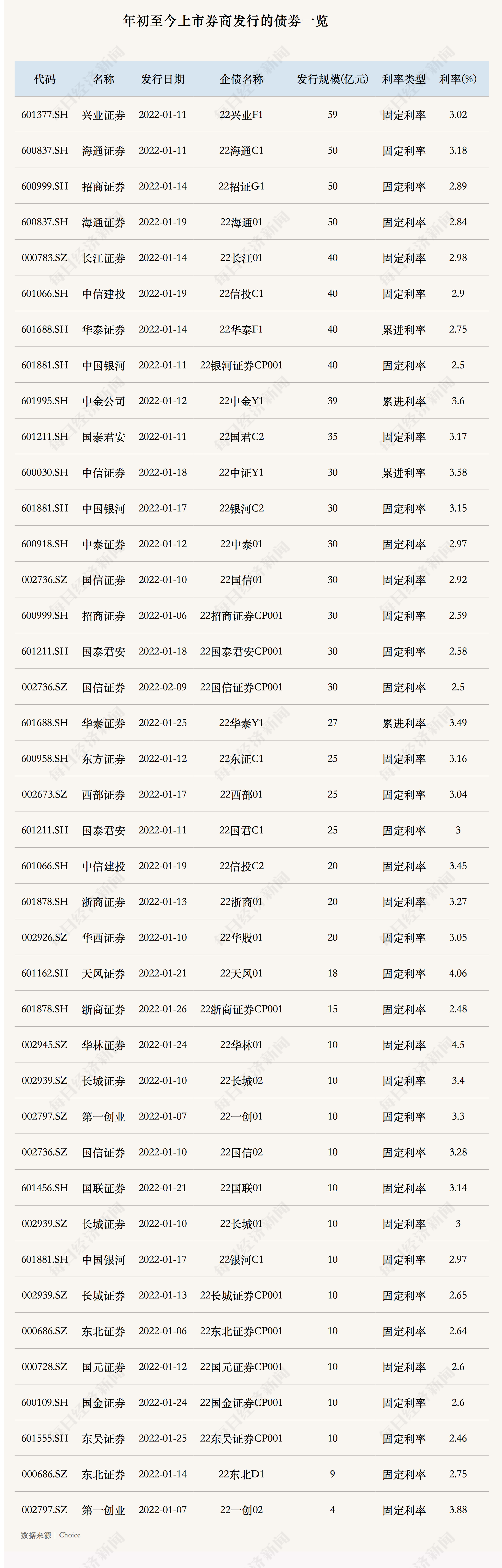 2022年1月以来,上市券商继续加快发债步伐。截至2月10日,已有40笔证券公司相关债券顺利发行,合计金额达到981亿元。单笔金额最高的是兴业证券1月11日发行的“22兴业F1”,募集资金59亿元。