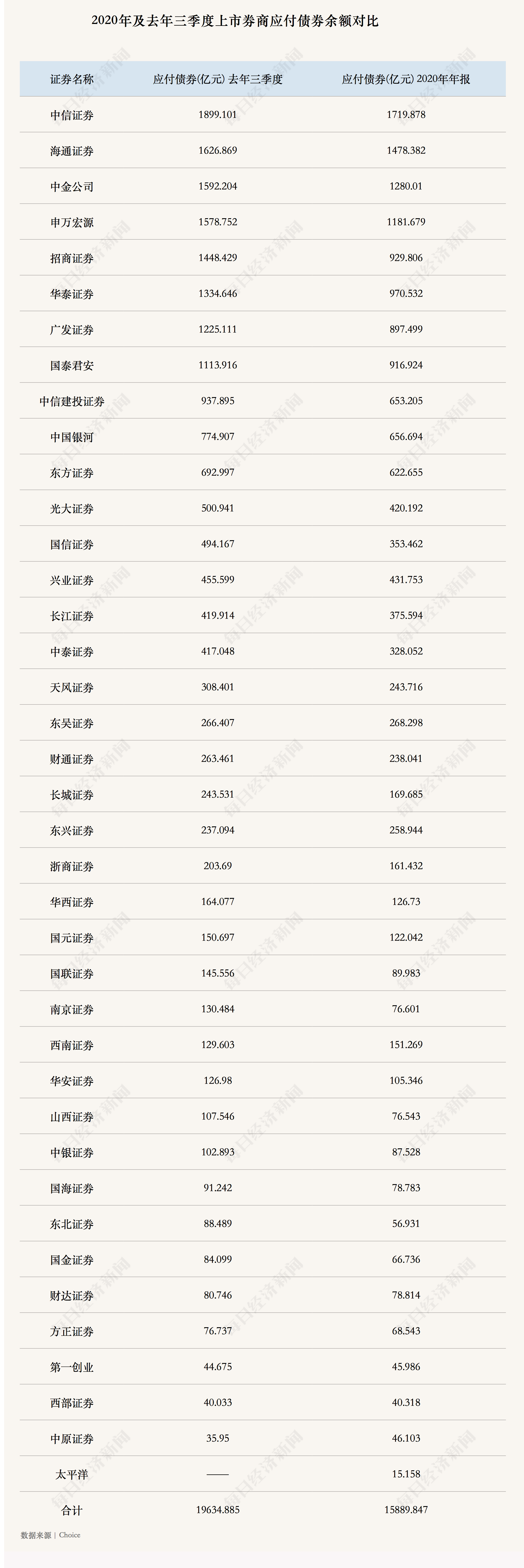 根据东方财富Choice金融终端数据,2021年前三季度,41家上市券商的应付债券余额高达19634.88亿元,较年初的15889.84亿元大幅增加了3745.04亿元。