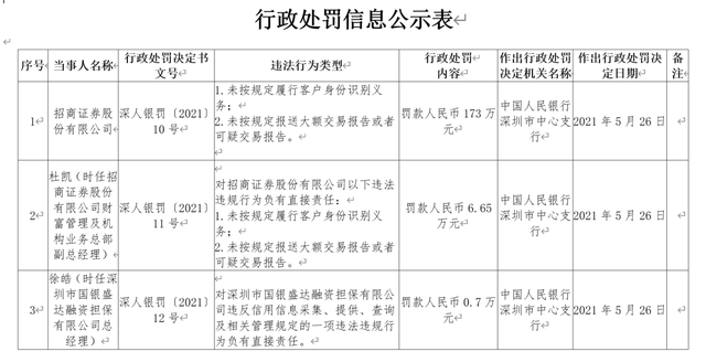 罚单显示,杜凯(时任招商证券股份有限公司财富管理及机构业务总部副总经理)、朱涛(时任招商证券股份有限公司法律合规部总经理)对该公司上述违法违规行为负有直接责任。中国人民银行深圳市中心支行对杜凯处以罚款6.65万元,对朱涛处以罚款8.4万元。