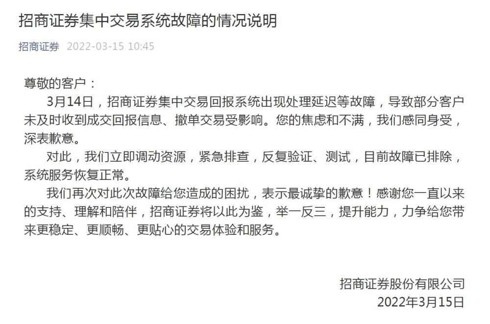 针对集中交易系统故障问题,15日,招商证券官方微信发布情况说明称,目前故障已排除,系统服务恢复正常。