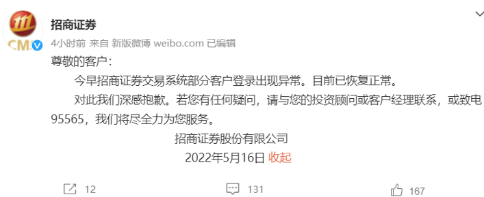 两个月前,2022年3月14日,有网友在社交平台反映招商证券交易系统出现故障,包括无法成交和无法撤回交易等问题,当时招商证券交易系统故障曾一度被炒上热搜。