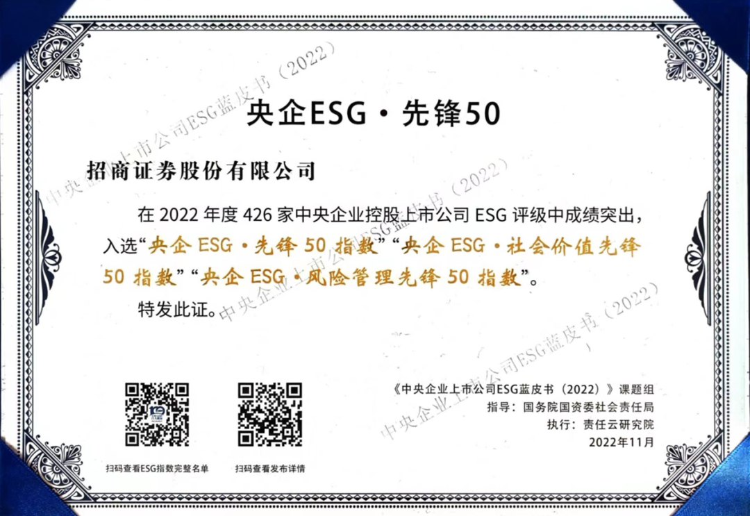 招商证券是百年招商局旗下核心金融企业,始终以“助推中国经济转型升级、助力社会财富保值增值”为使命,坚定履行企业责任,高度重视可持续发展工作。近年来,公司围绕ESG核心议题,坚持发展绿色金融,积极投身社会公益,不断完善公司治理,组织开展一系列系统深入,富有成效的有关工作。