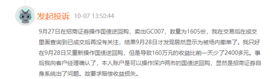 投资者表示,9月27日在招商证券操作国债逆回购,卖出GC007,数量为1605份,我在交易后在成交里面查询到已成交后再没有关注,结果9月28日才发现居然显示为被场内撤单了。我只好在9月28日又重新操作国债逆回购,但是导致160万元的收益比前一天少了2400多元。事后我向客户经理确认了,本人账户是可以操作深沪两市的国债逆回购,显然是招商证券自身系统出了问题。故要求赔偿收益损失。
