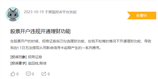 投资者表示,在股票开户的时候,招商证券自己勾选理财功能,在我不知情的情况下开通理财功能,导致我在t 1日无法提现从而影响信用卡逾期产生的一系列费用。