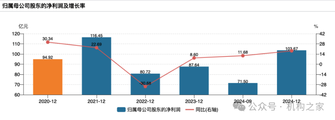 从扣非后归属母公司股东的净利润来看,招商证券2024年实现103.58亿元,同比增长18.62%,略高于归母净利润的增速,表明公司的盈利质量较好,主营业务贡献了绝大部分利润。