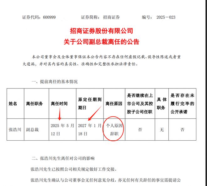 不曾想才1个周左右的时间,招商证券再有人事变动,公司副总裁张浩川因个人原因辞职,已按照公司规定完成工作交接。