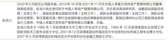 随后他加入中国人寿资产管理有限公司,历任资深高级研究员、战略规划部副总、直接投资事业部副总、国际业务部副总、国际业务部总经理。从这也可以看出,张浩川一直从事的就是战略规划、资管业务,在中国人寿一直负责的是海外资管业务。