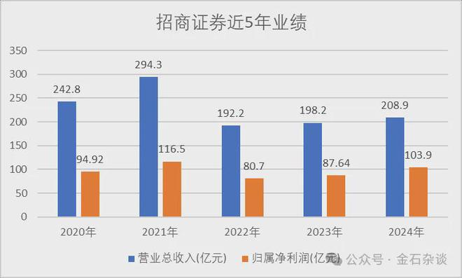 招商证券近5年业绩来看,2021年业绩达到顶峰,收入294亿,利润116.5亿,目前收入维持在200亿左右,增长缓慢;而这三年利润则稳步增长,2024年利润增长18.51%至103.9亿。 2025年一季度来看,招商证券实现营收、利润双双增长,一季度利润实现23.08亿,同比增长6.97%。