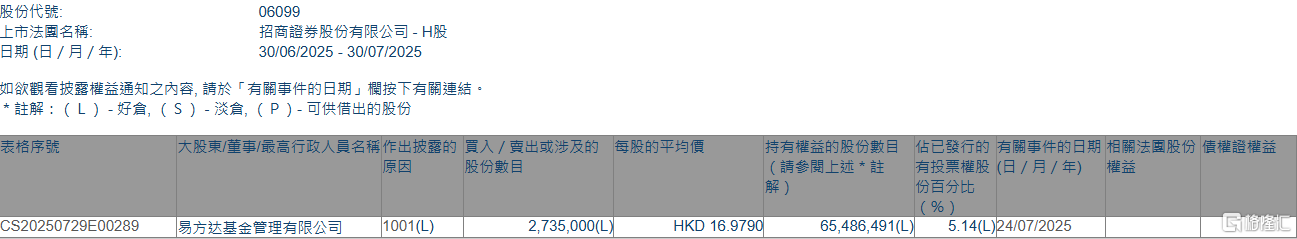 格隆汇7月30日丨根据联交所最新权益披露资料显示,2025年7月24日,招商证券(06099.HK)获易方达基金管理有限公司在场内以每股均价16.979港元增持273.5万股,涉资约4643.76万港元。