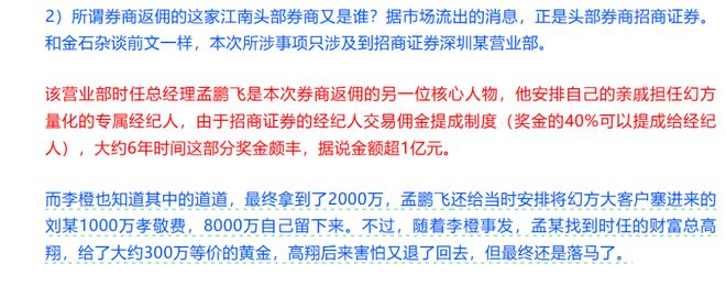 此前,有媒体爆出,幻方量化市场总监李橙和招商证券之间返佣的事情,因涉嫌利益输送,李橙被抓,招商证券财富总高翔也牵扯其中。本次涉资金额巨大,高达1.18亿。