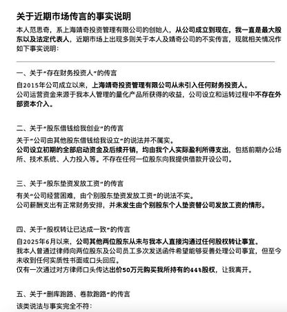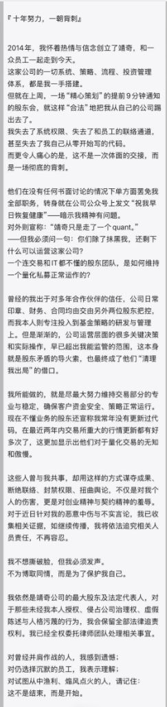 6月10日,知名量化私募清盘,基金经理范思奇对投资人表示,本人将于本月卸任靖奇投资基金经理职务,所管基金也将进入清盘程序。本以为是一次正常的离职,谁知道竟然是内斗的结果。