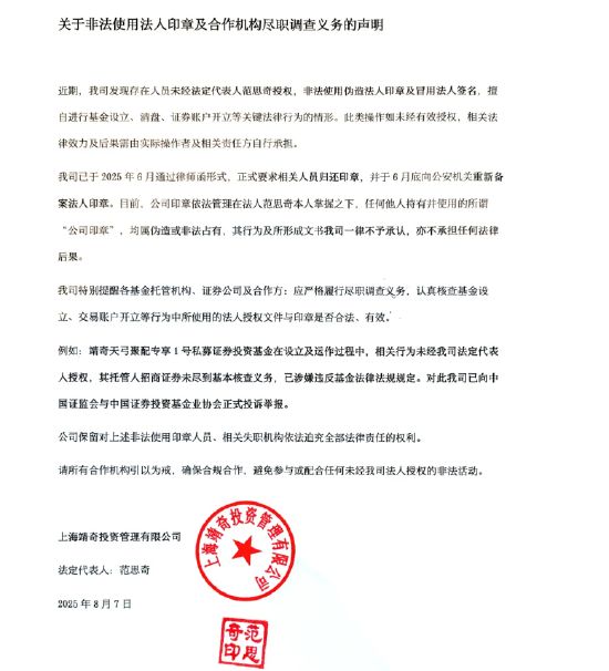 8月7日,量化私募靖奇投资发布一则风险警示公告,矛头直指招商证券的托管职责失守。而这份声明同样来自范思奇,而其代表的依然是靖奇投资,说自己的法人章被冒用和伪造,招商证券作为托管人未履行监督职责,已涉嫌违反基金法律法规规定。